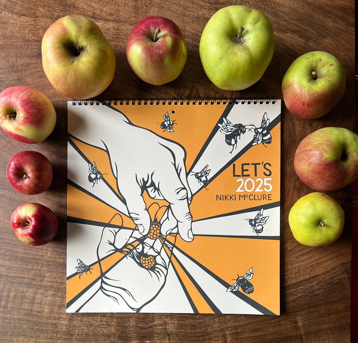 This is my 27th calendar! That’s a lot of scampering up tall trees and stashing leaves. The stack of all the years of calendars is about eight inches tall. Twenty seven years in eight inches, a geological strata of not very long, yet it is expansive. Whole lives! People ending and beginning. Trees planted and getting taller, bearing fruit and seeds and shade. Thank you for growing with me. Let’s see what happens in 2025!